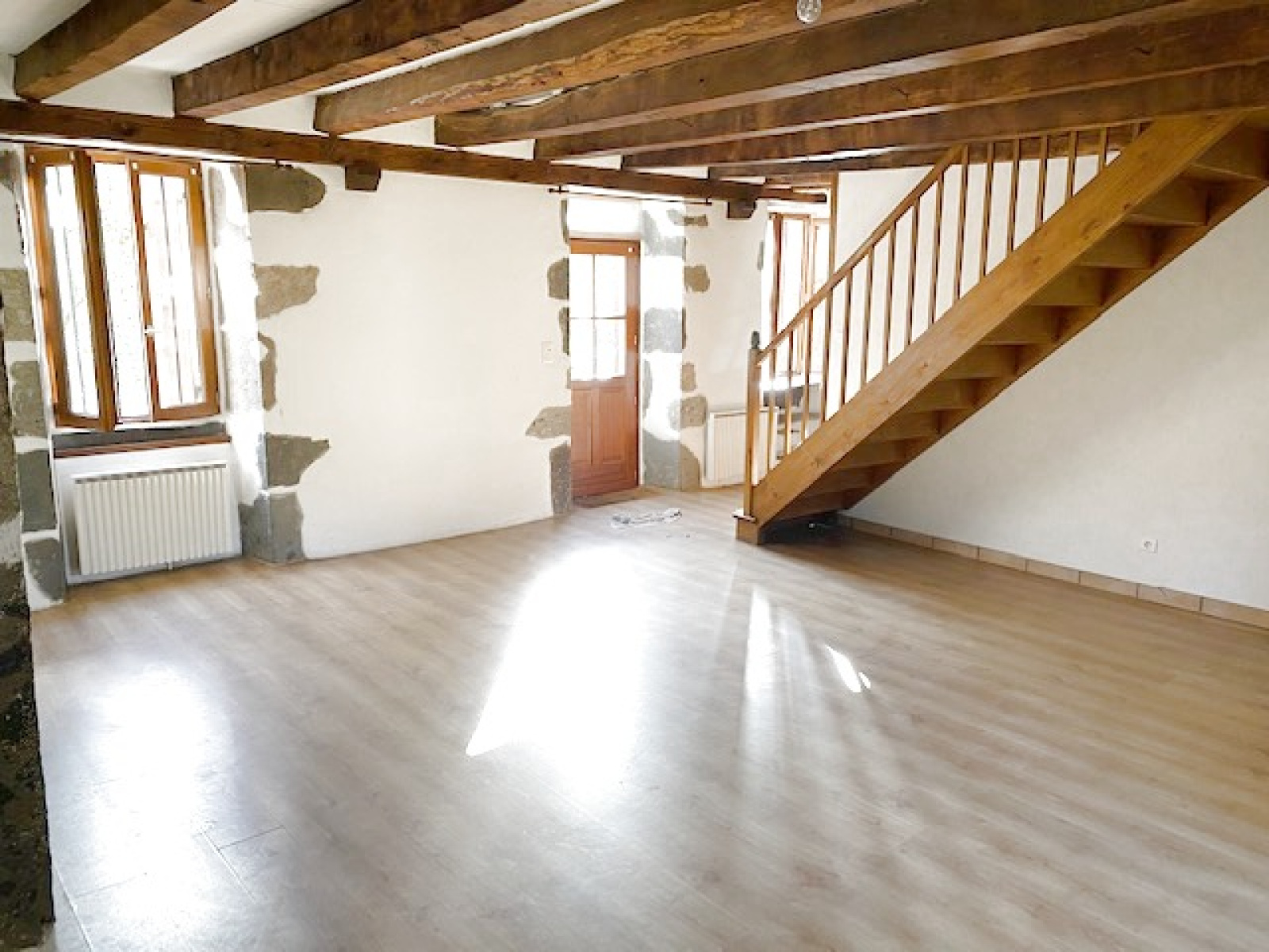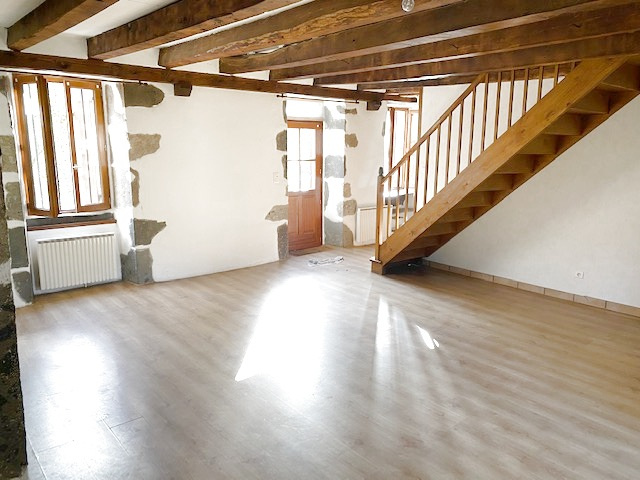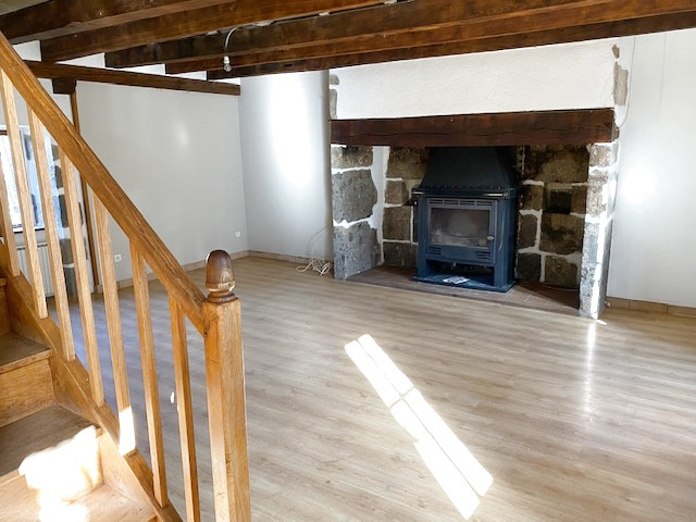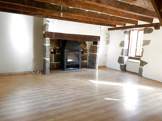 Une grande salle à manger avec cheminée et insert bois (crépis, pierre et plancher)