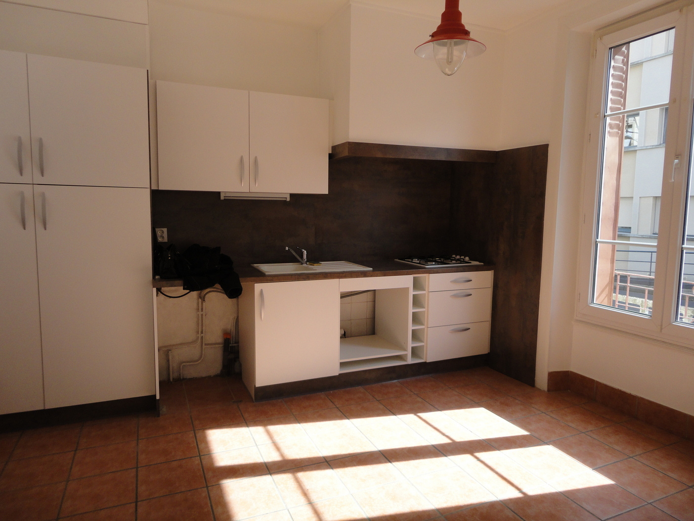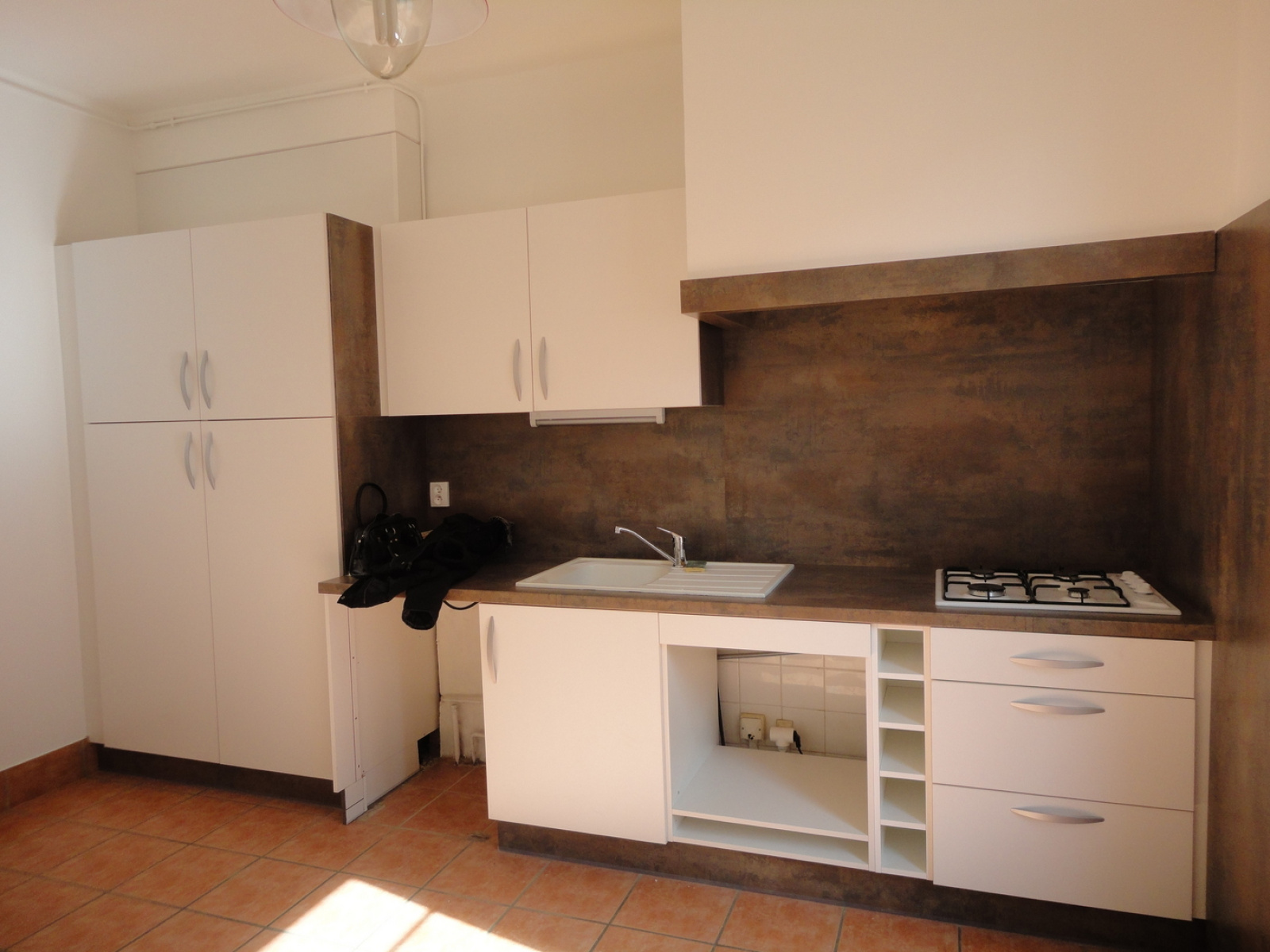 RDC : salle de séjour, cuisine (plan de travail, meubles haut et bas, hotte, plaque cuisson), chambre ou bureau, WC.