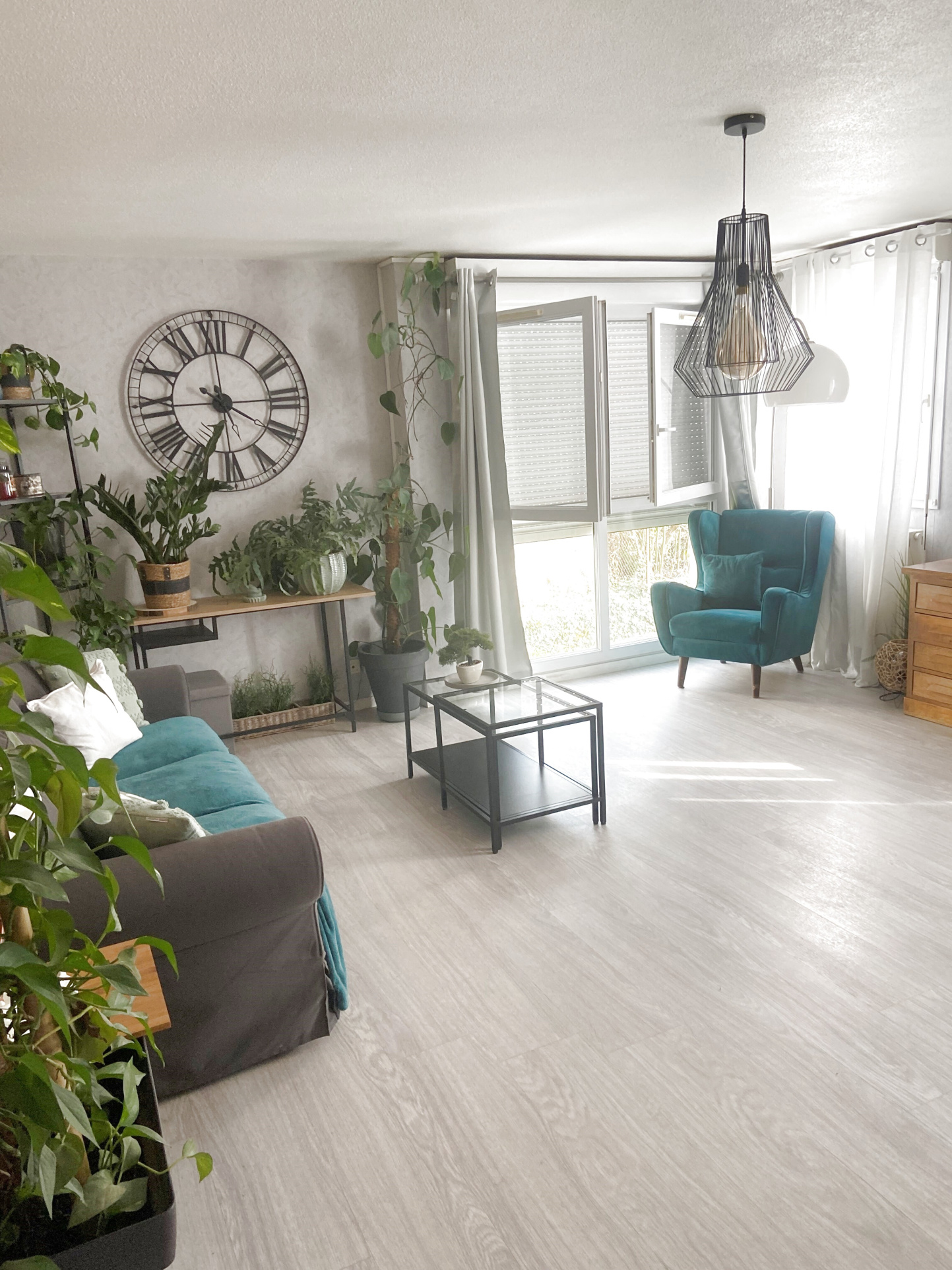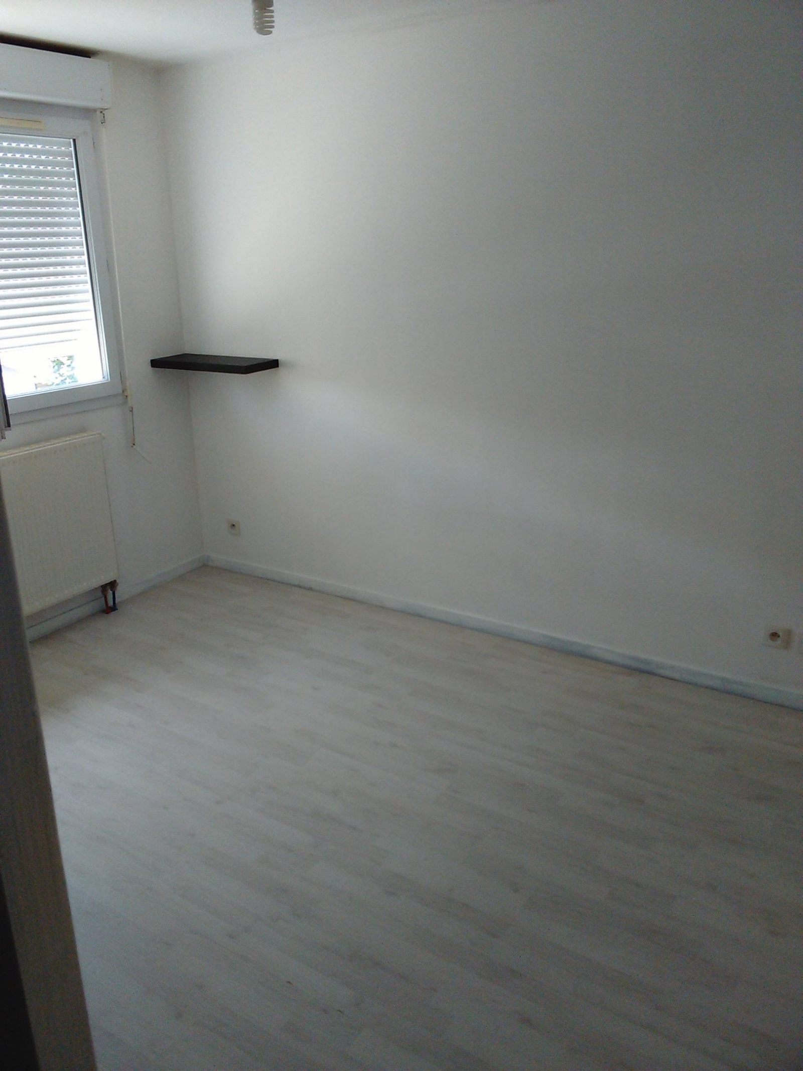 Entrée avec rangement, salle de séjour, cuisine ouverte (séparée par un bar : meubles haut, meuble sous évier, plaques 4 feux et four), WC, SDB (baignoire), 3 chambres (dont 1 avec dressing)