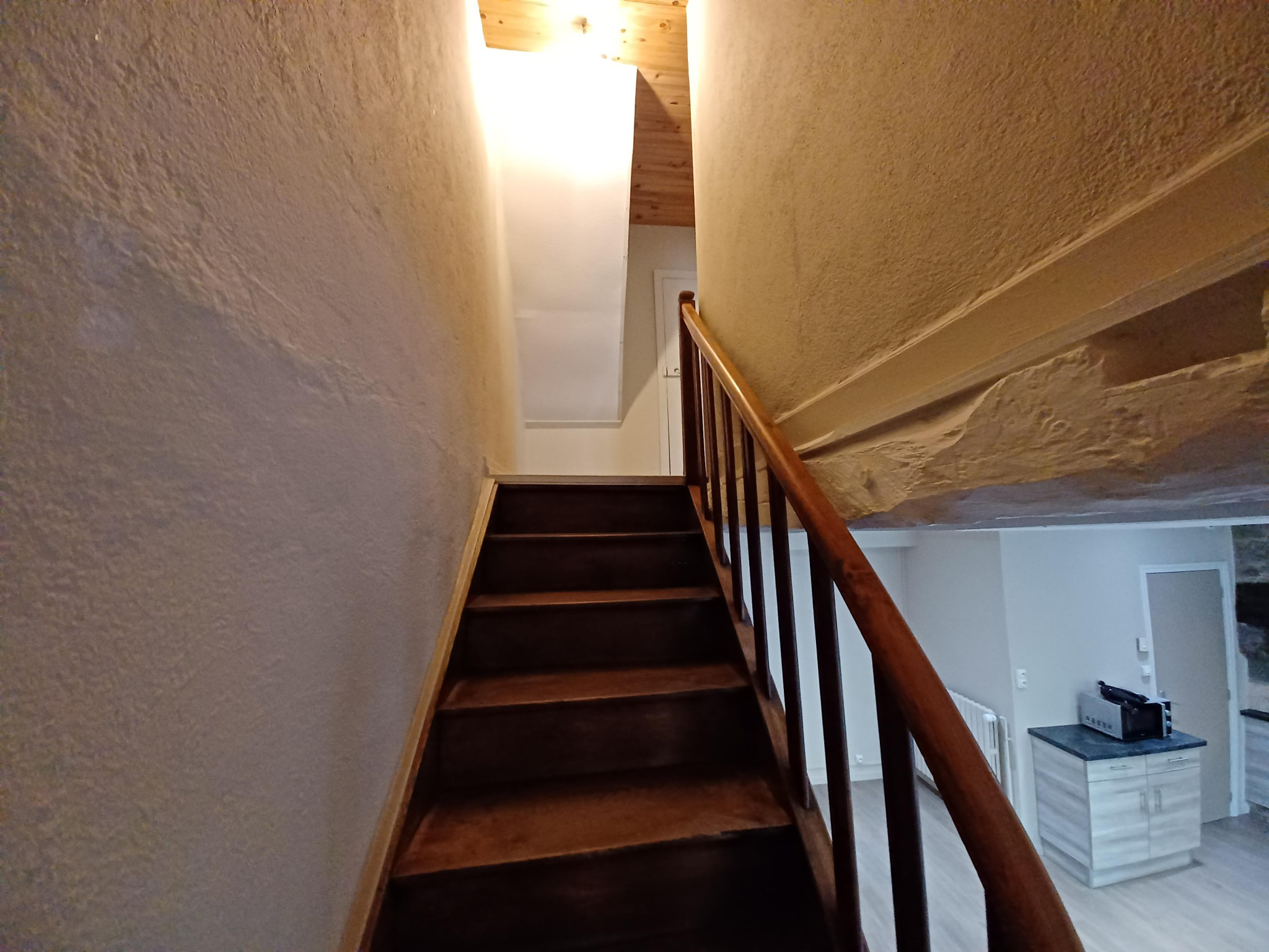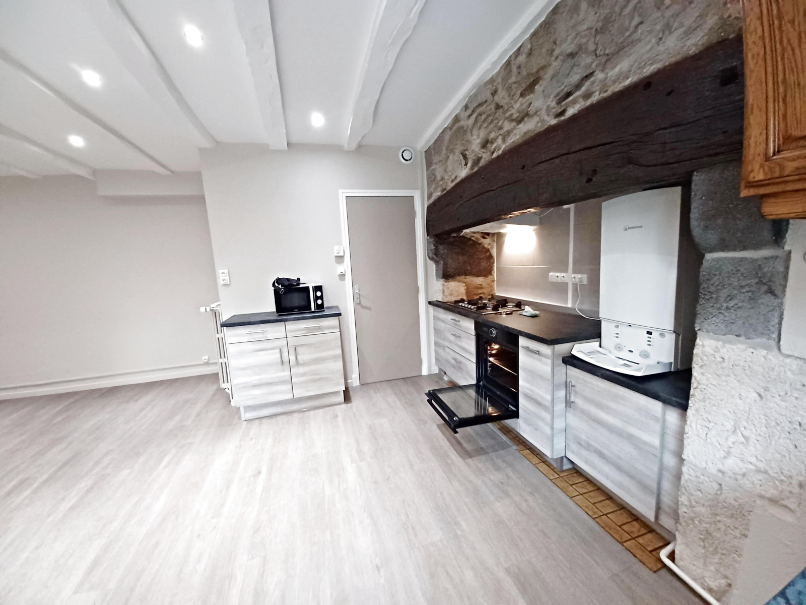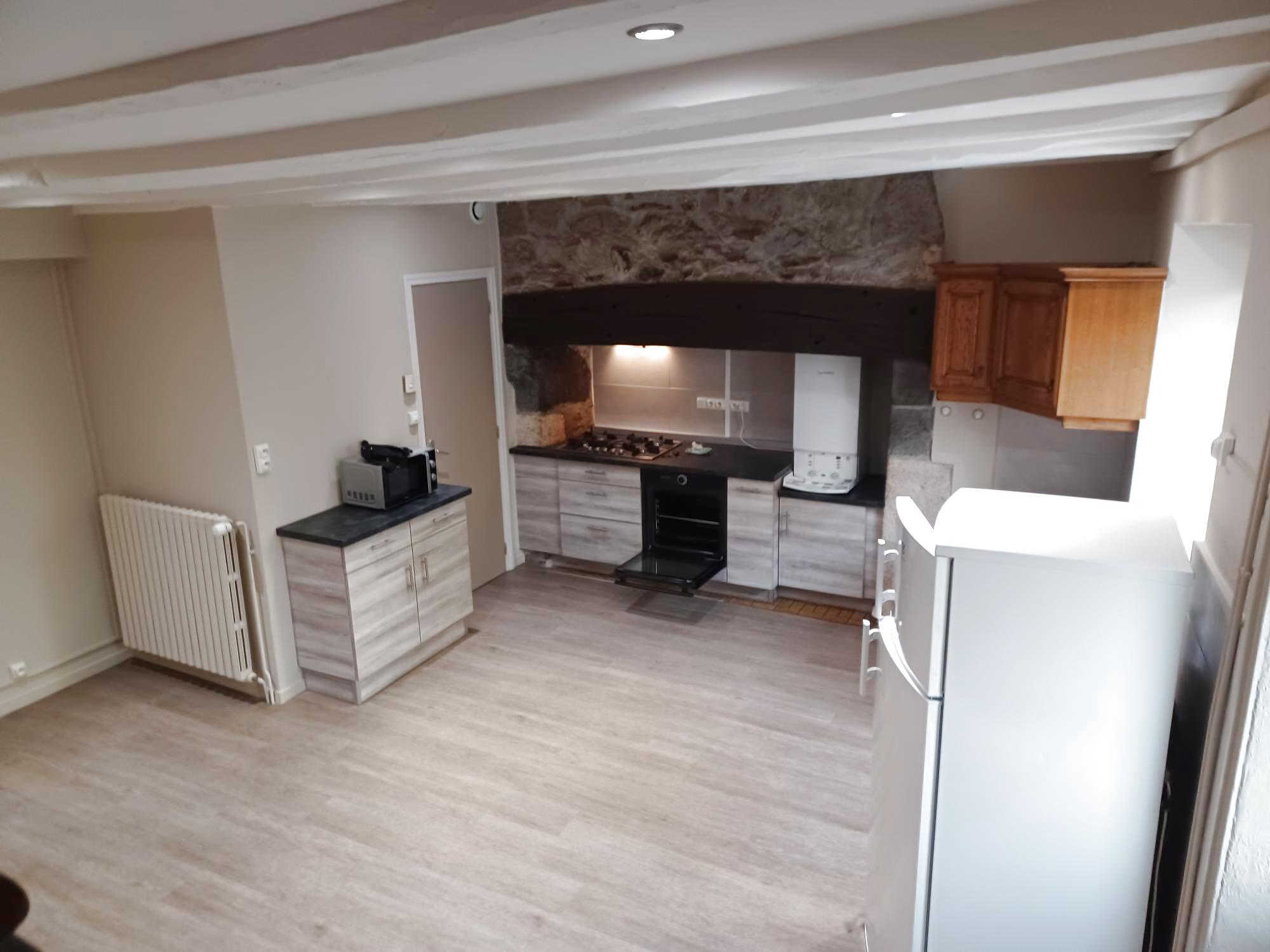RDC : cuisine ouverte (meubles haut et bas) sur pièce de pièce, salle d’eau, WC et accès cave sous maison